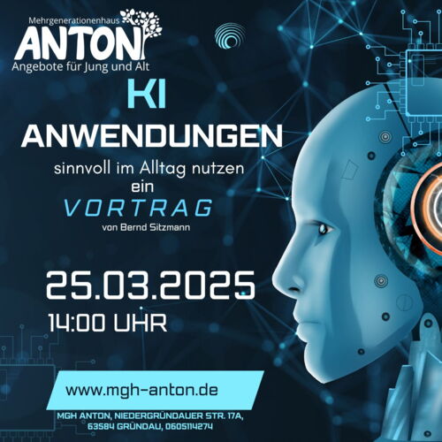 Am 25.03.2025 um 14.00 Uhr findet im Mehrgenerationenhaus Anton ein interessanter Vortrag von Herrn Sitzmann statt, der sich mit den vielfältigen Anwendungen von Künstlicher Intelligenz (KI) befasst. Unter dem Motto „Zukunft gestalten – KI für alle Generationen“ erläutert Herr Sitzmann, wie KI-Technologien dazu beitragen können, das Leben zu bereichern und zu erleichtern.